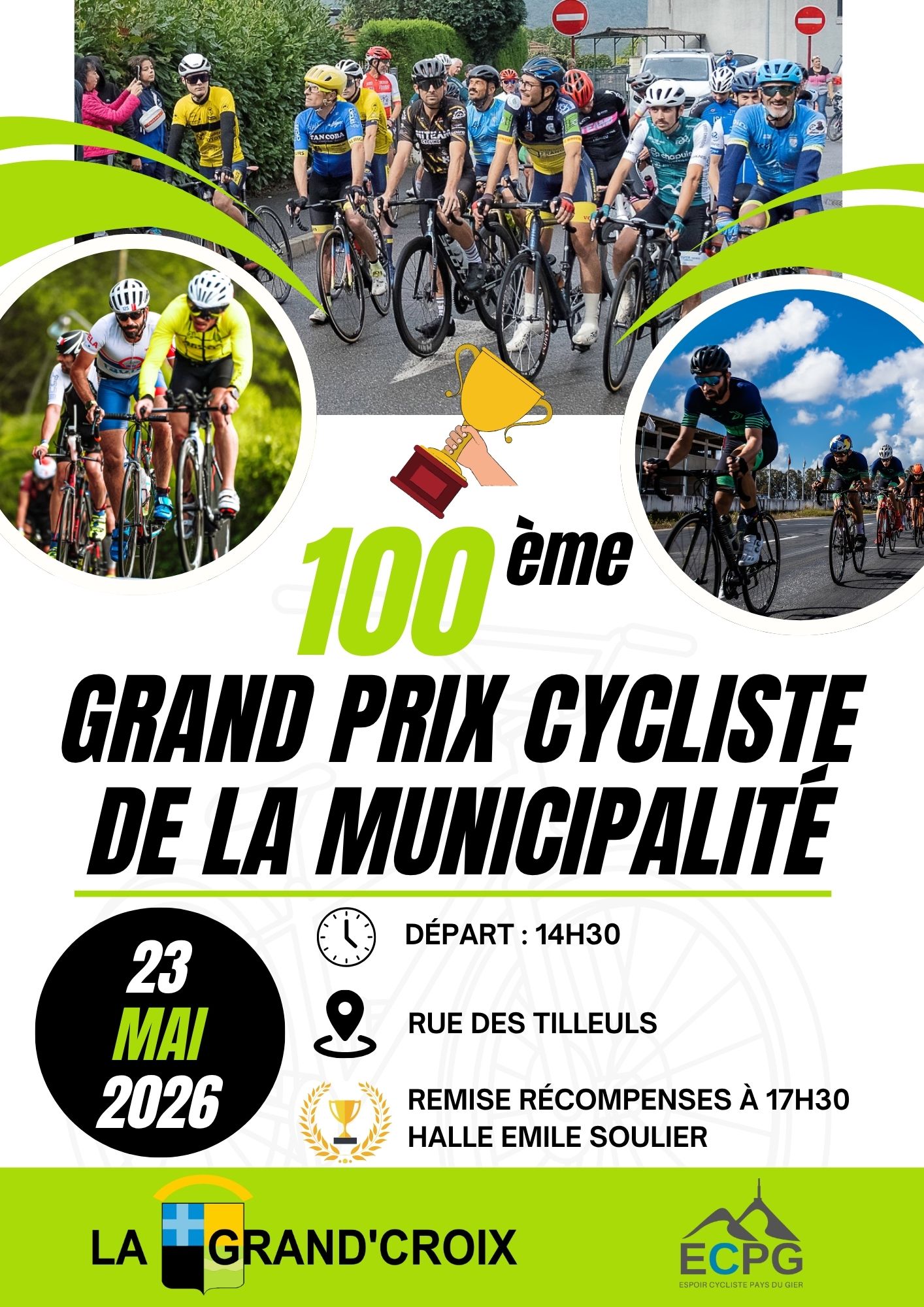 Le samedi 23 mai 2026, venez célébrer avec nous la 100ème édition du Grand Prix Cycliste de la municipalité de La Grand’Croix, un événement emblématique organisé par l’Espoir Cycliste Pays de Gier.