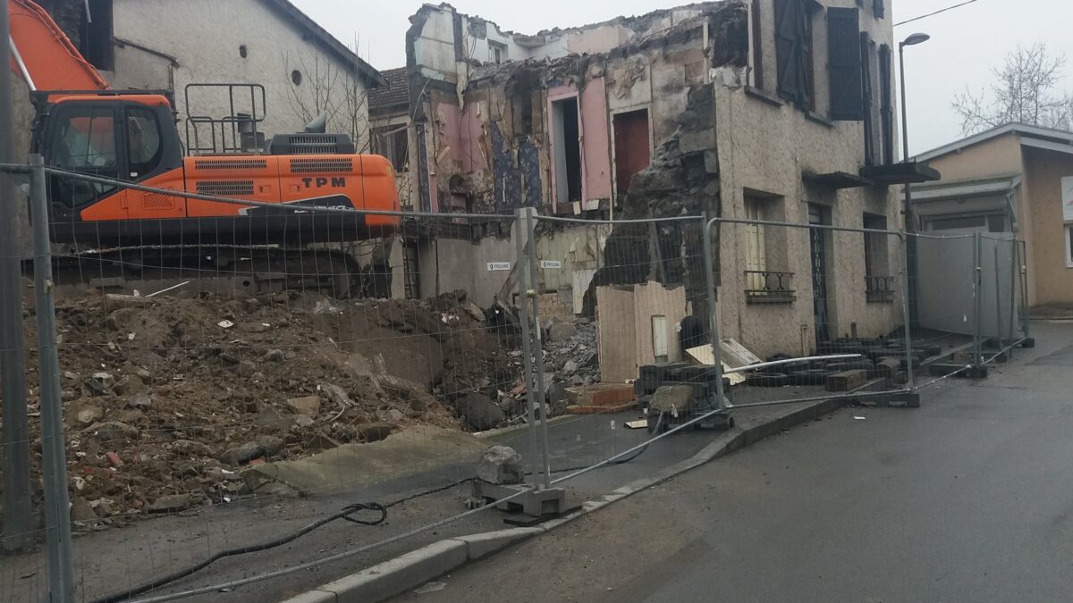 Après les travaux de désamiantage et curages préalables, le voisinage proche a vu arriver des engins impressionnants venus « grignoter » les anciennes habitations ainsi qu’un lieu bien connu des grandcroisiens : l’ancienne salle communale Paul Couchoud.